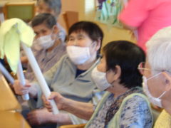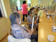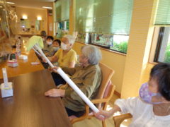 ある日のレクリエーションでは、ニワトリ形のように膨らんだゴム手袋を得点表めがけて投げて頂き、何点得点が獲得できるか挑戦していただきました。ふわふわとしていてなかなか難しくご利用者様も投げ方を工夫されながら楽しんで頂けました☆