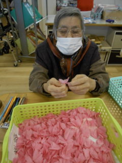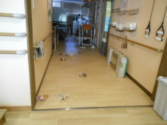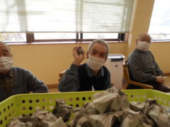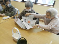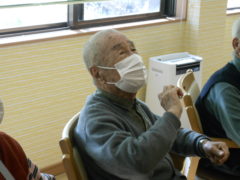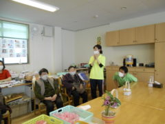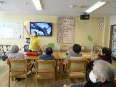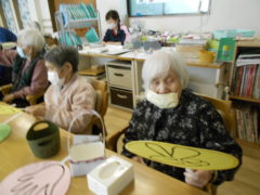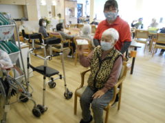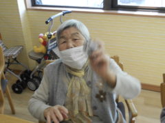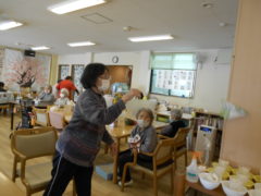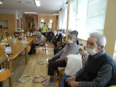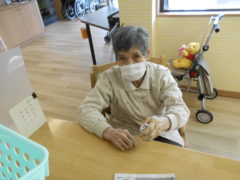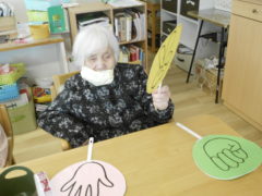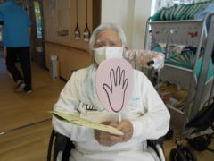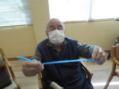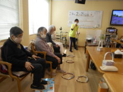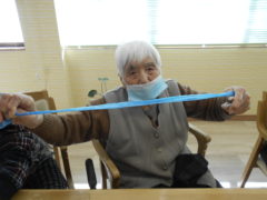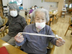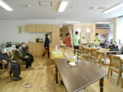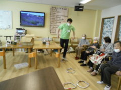 ある日のレクリエーションでは、利用者様に2列に分かれて頂き、リングを利用者様に投げて頂きたところをけんけんぱでスタッフが進んでいくゲームをおこないました☆スタッフが早くゴールできるように利用者様に協力頂き楽しくけんけんぱを行うことが出来ました☆