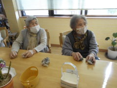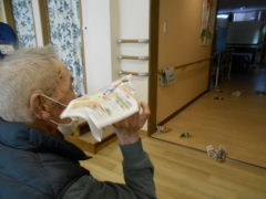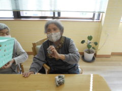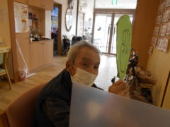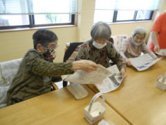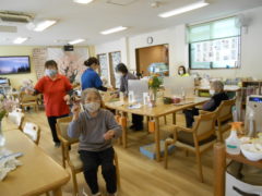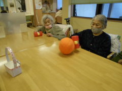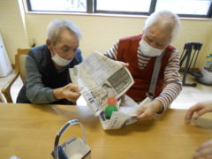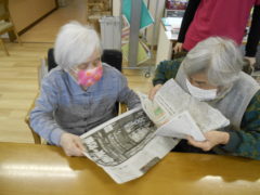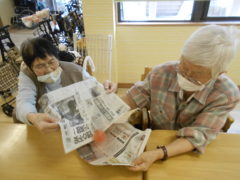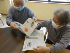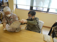 ある日のレクリエーションでは、新聞紙を両手で持っていただき、新聞の上にボールをお隣りの方へつないでいっていただきリレーを行いました☆皆様で声を掛け合いながら協力して楽しんでいただけました♬