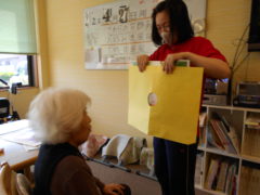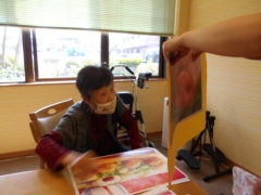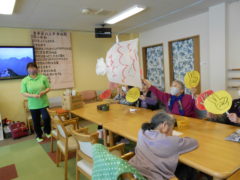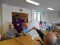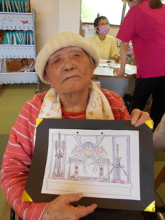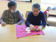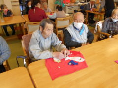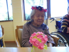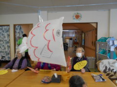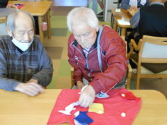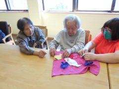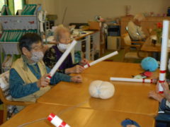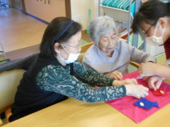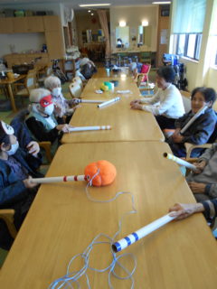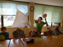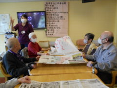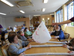テーブルに向かい合わせで座っていただき、向かい合わせで新聞紙を持っていただき、フワフワ鯉のぼりをゴールまで導きました!ご利用者様の力が合わさり、フワフワ鯉のぼりも気持ちよさそう泳いでいるようでした♬