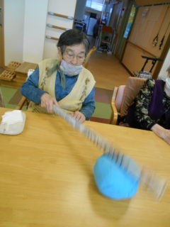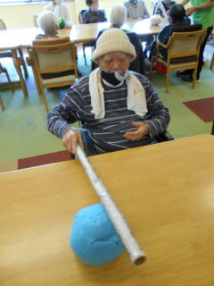 この日のレクリエーションでは、紙風船を新聞紙の棒で割りあい、一足早くスイカ割り気分で楽しんで頂きました☆目隠しをしスタッフの掛け声で割っていただく難易度でも行ったりと、ご利用者様皆様に楽しんで頂けました♬