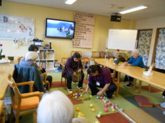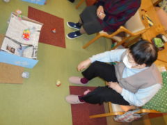この日のレクリエーションは、ご利用者様に作っていただいたペーパーボールを様々な点数の枠をめがけ何得点獲得できるか投げていいただくゲームを行いました!点数の枠からはみ出さないようにと皆様集中して投げ楽しんでらっしゃいました♬