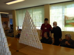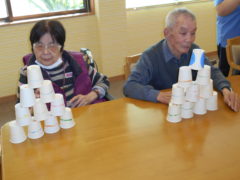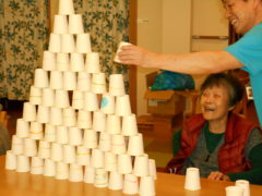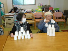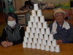 この日のレクリエーションでは、ご利用者様に紙コップを数多く積み上げて頂きました!ご利用者様の前には紙コップでできあがった見事な山がいくつもできあがりました♬
