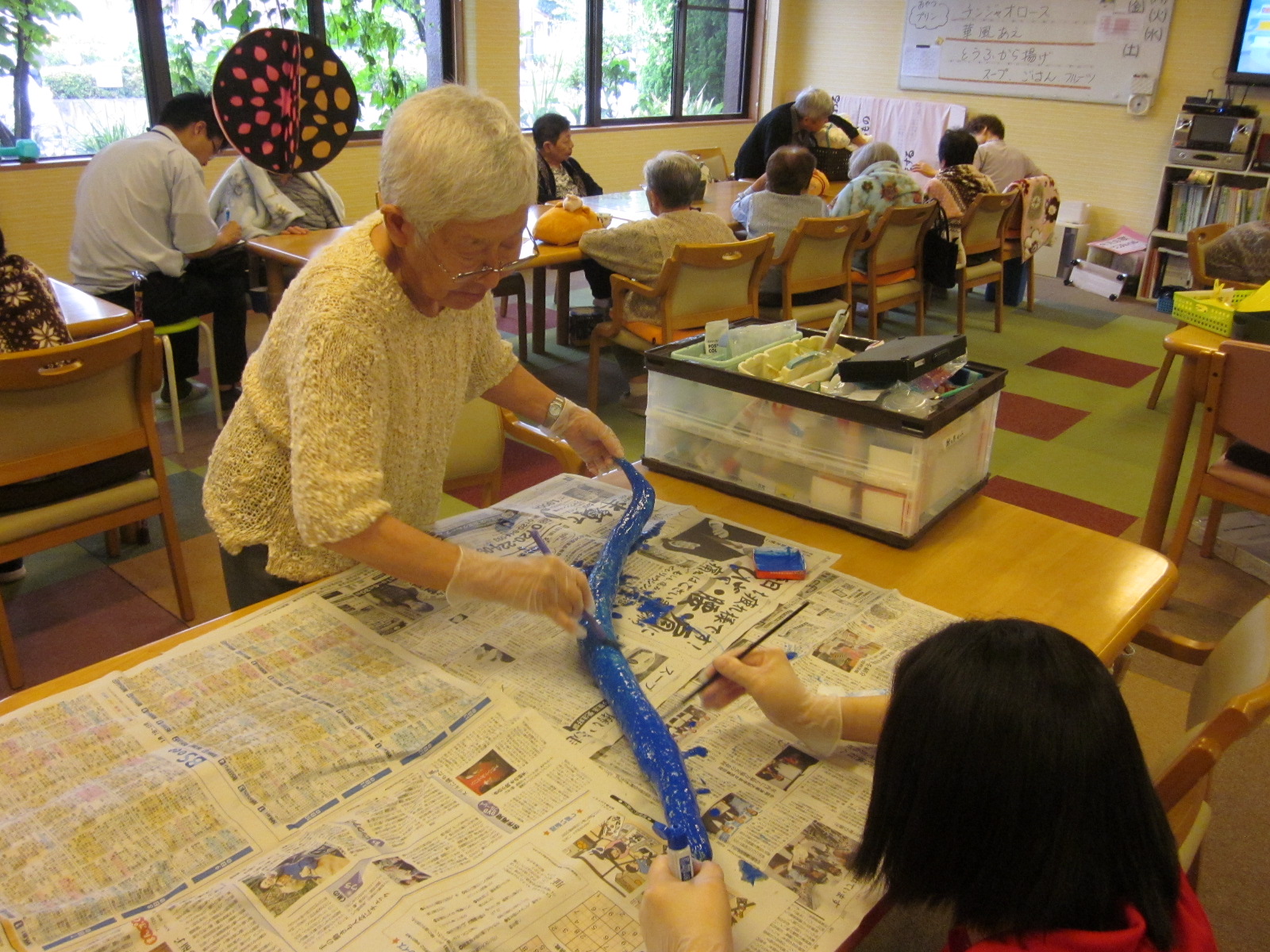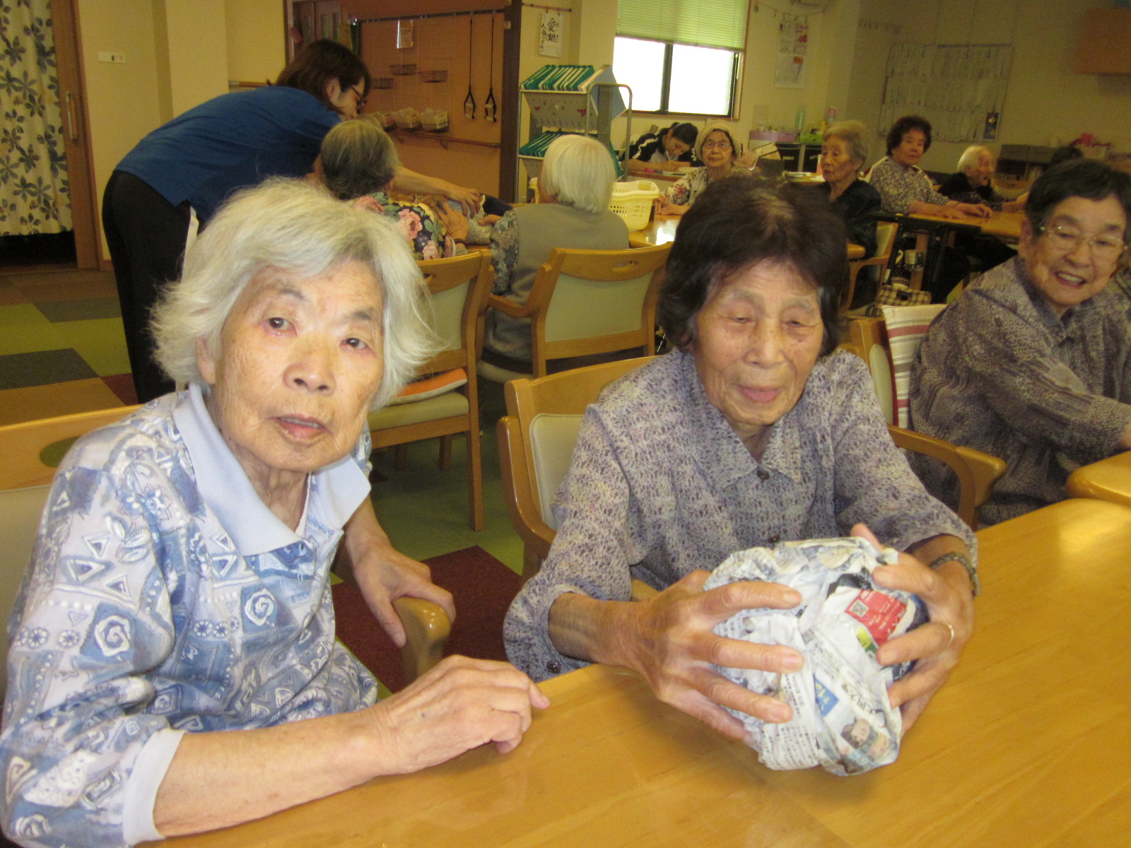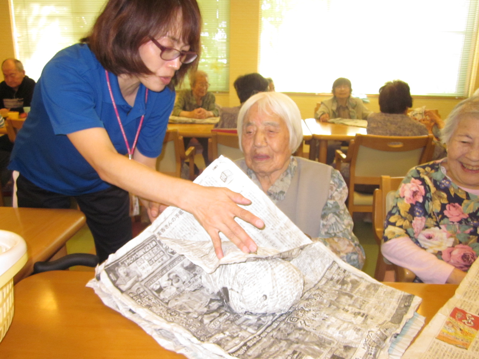 レクで使用済の新聞紙、いつも皆さんで協力して手元の新聞紙を巻付け大きくしていきます