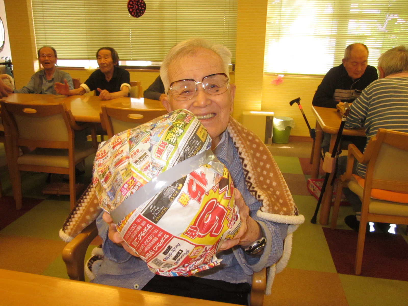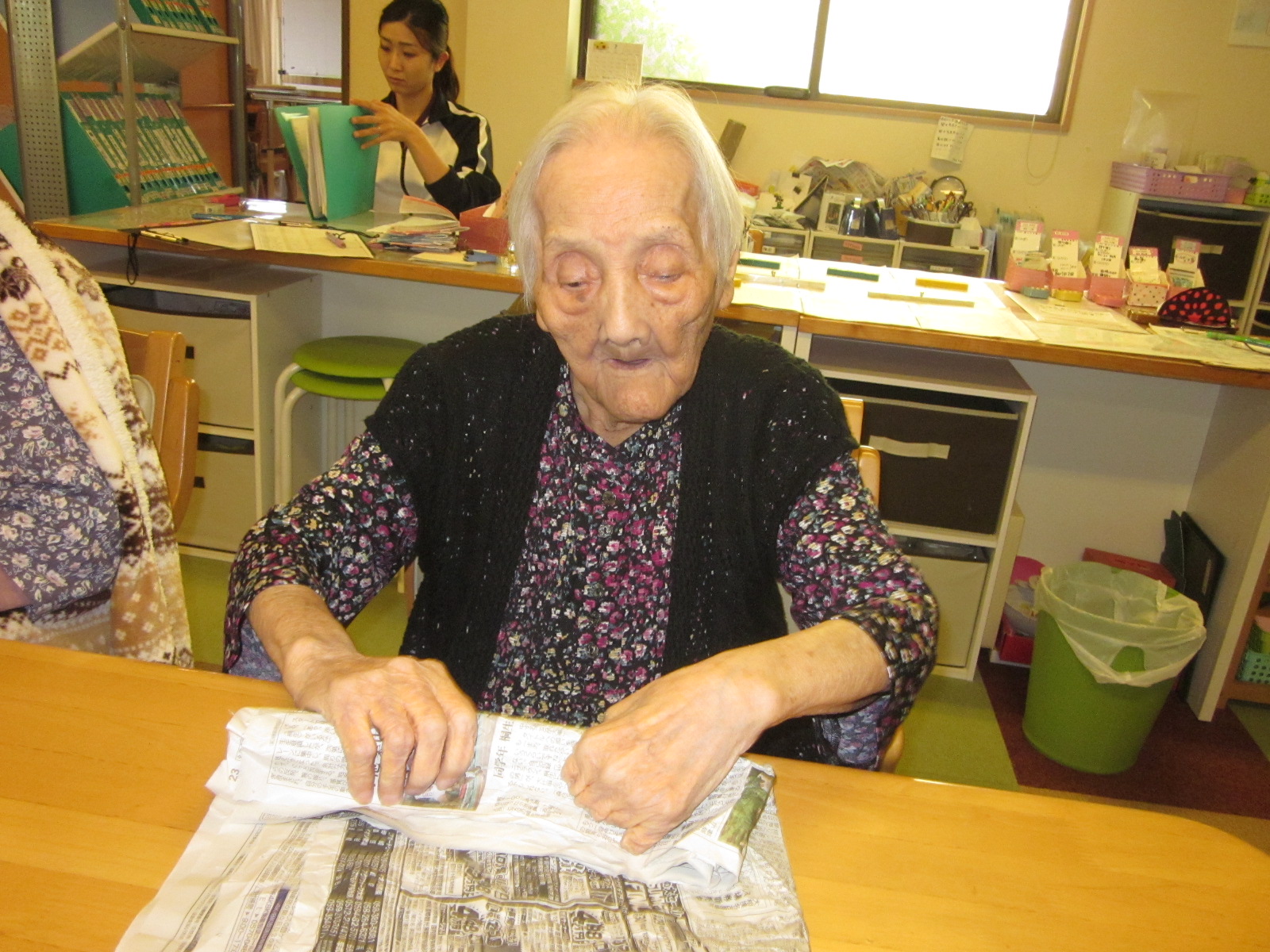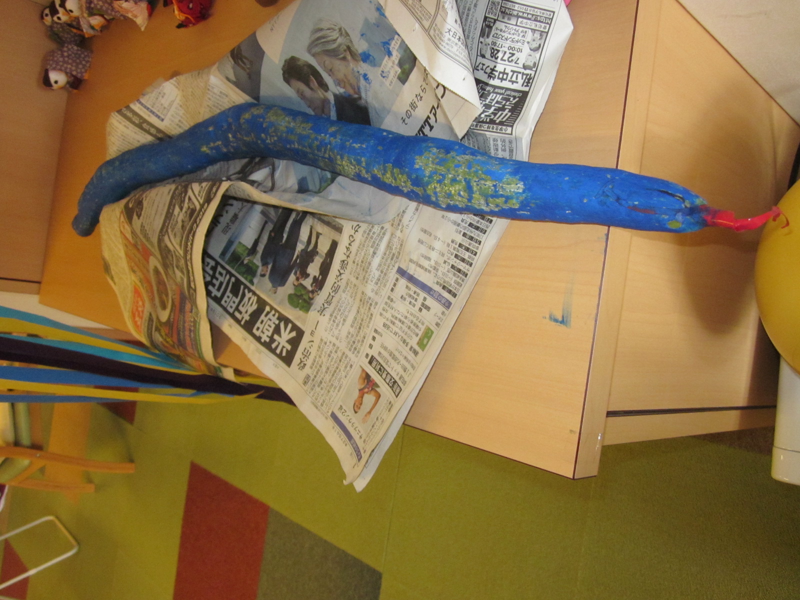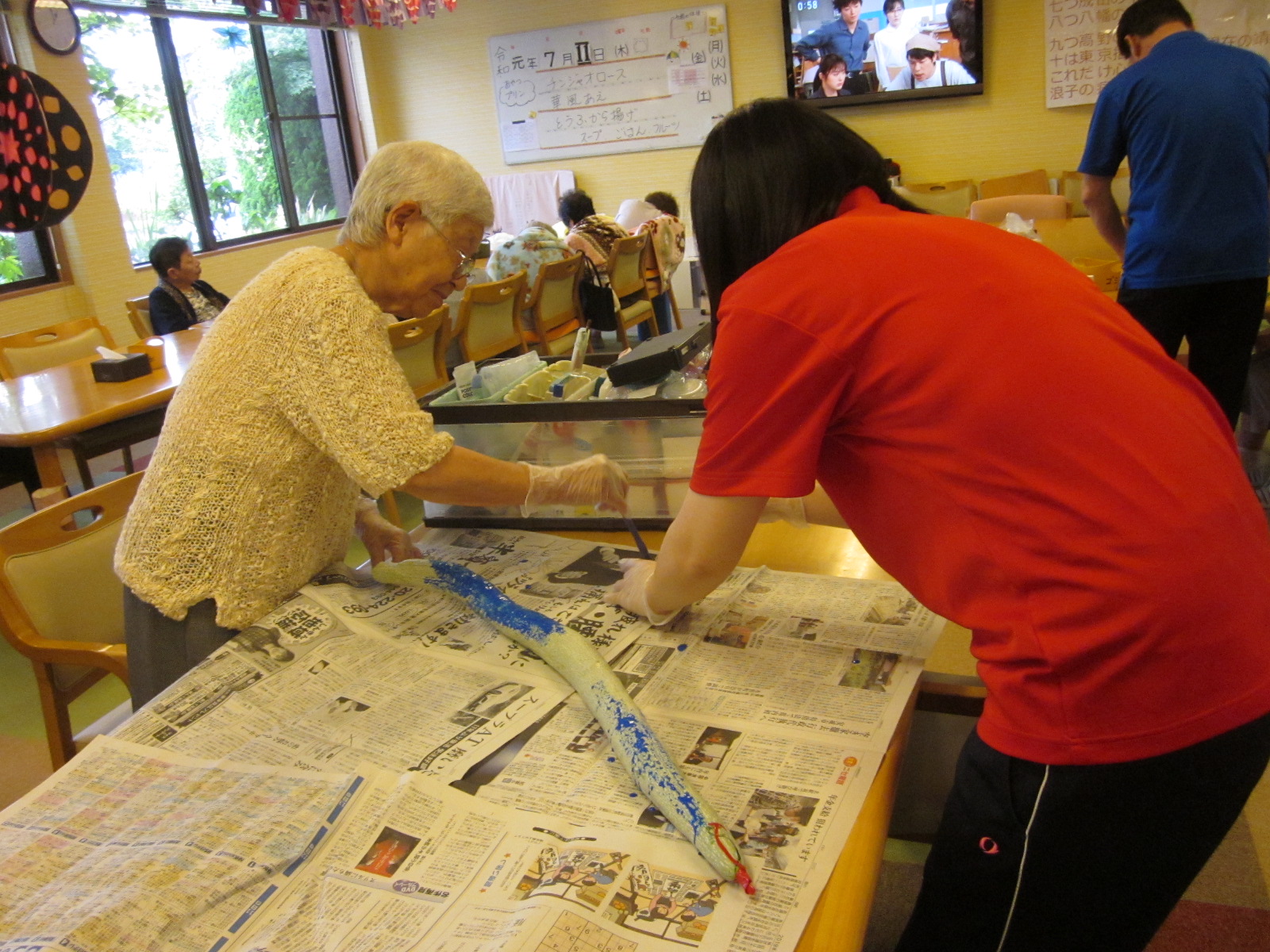 レクで使用済の新聞紙、いつも皆さんで協力して手元の新聞紙を巻付け大きくしていきます