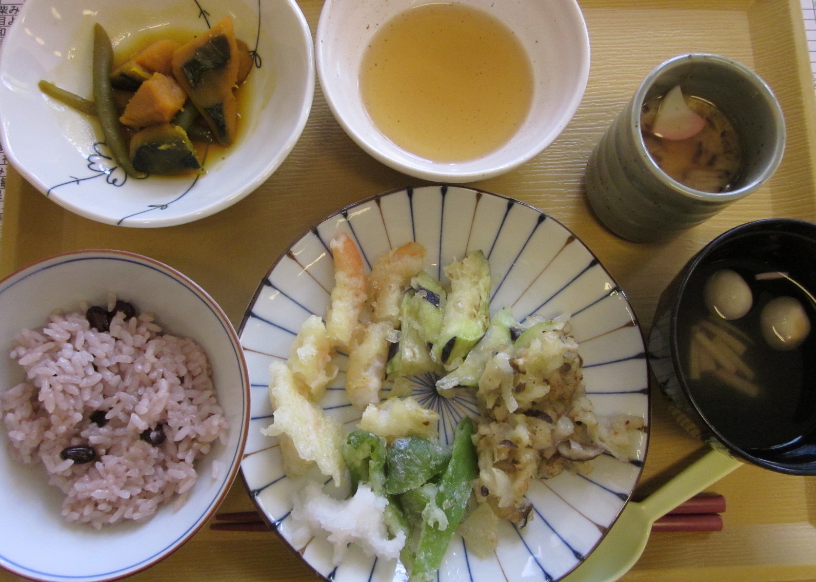 今月の敬老会に伴い、第4週目の昼食時には、赤飯かごはんかを御利用者様に選択して召し上がっていただきました。こちらはある日の昼食です。この日のメニューは、天ぷら・茶わん蒸し・かぼちゃの煮物・お吸い物・赤飯orごはん でした。赤飯を選択されるご利用者様も多く、楽しんで召し上がって頂けました☆
