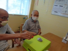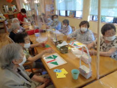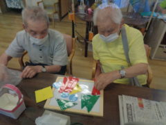 ある日のレクリエーションは〇△□の形のマグネットを組み合わせてそれぞれの作品を作っていただきました。
