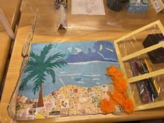 ①夏の海岸風景 (色紙や切手を使っての貼り絵です。窓枠も段ボール等で作りました。とてもきれいです)