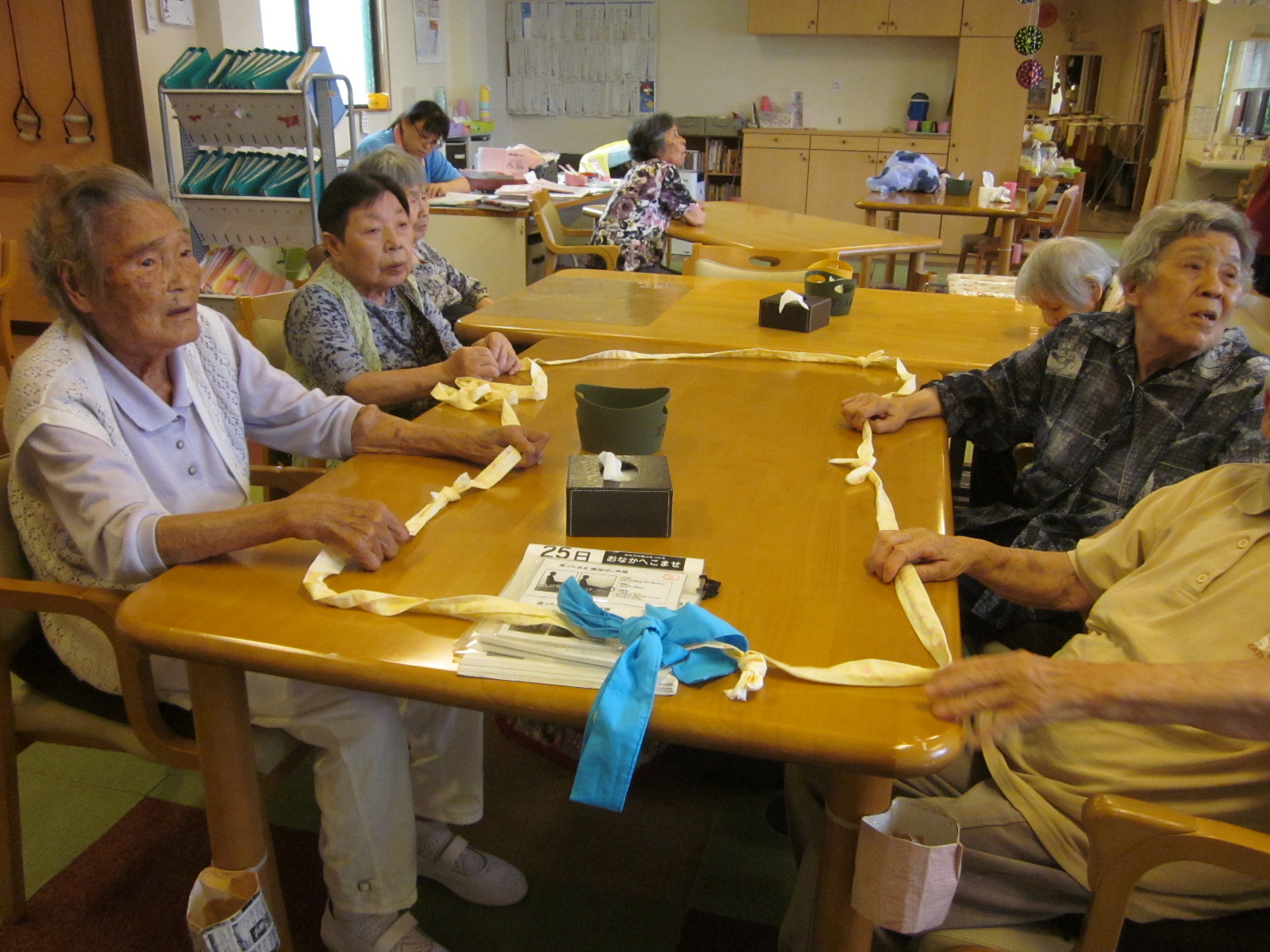 最後は皆の紐を輪に縛り、ポイントに色違いの紐を縛り歌を歌いながら回します