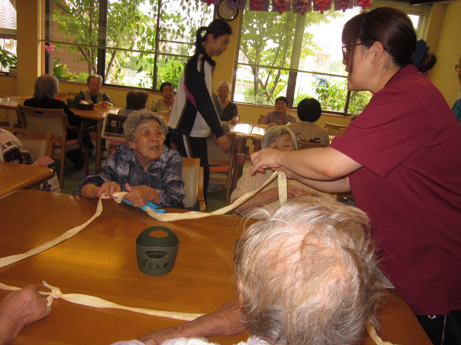初めは結び目を作ってほどいてを行い、誰が早く出来るかのゲームに変わると