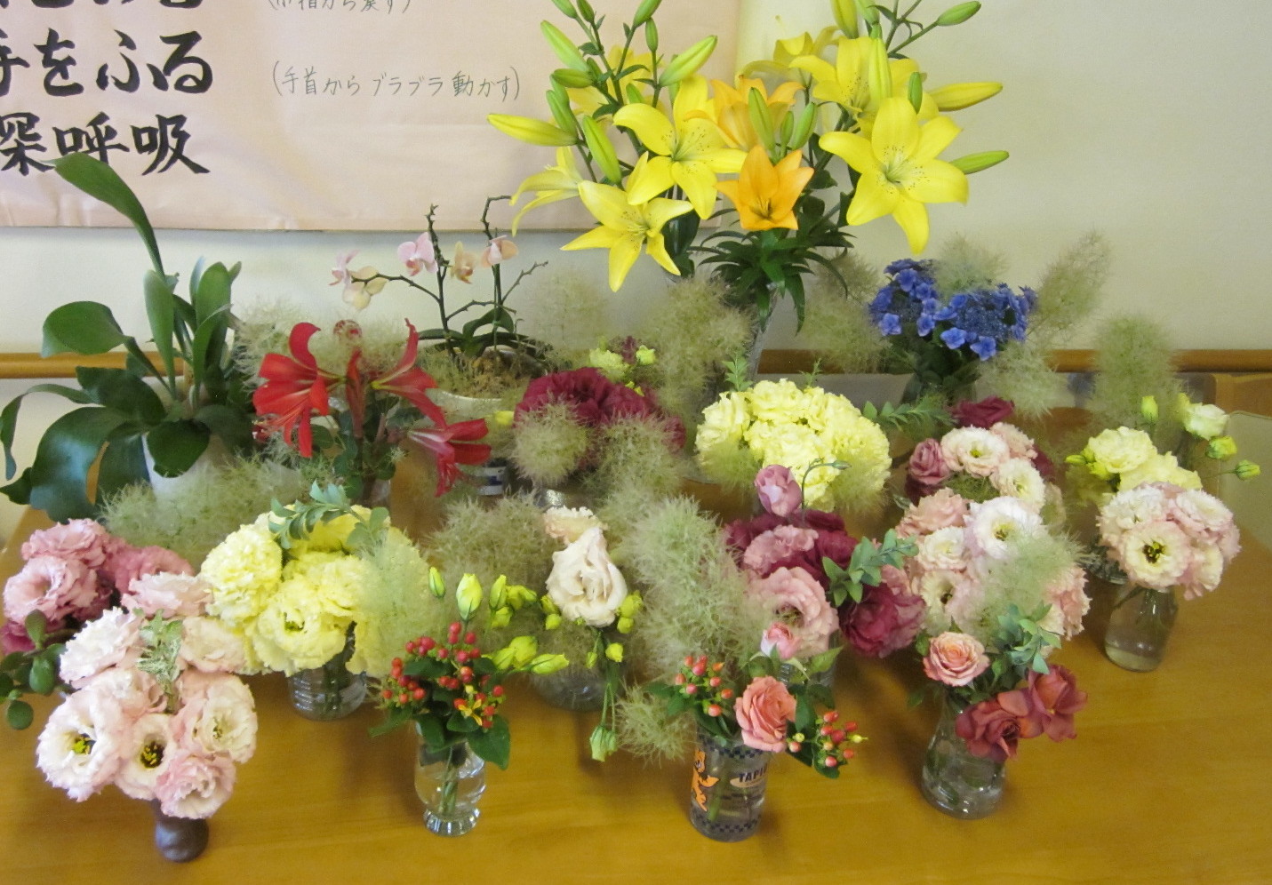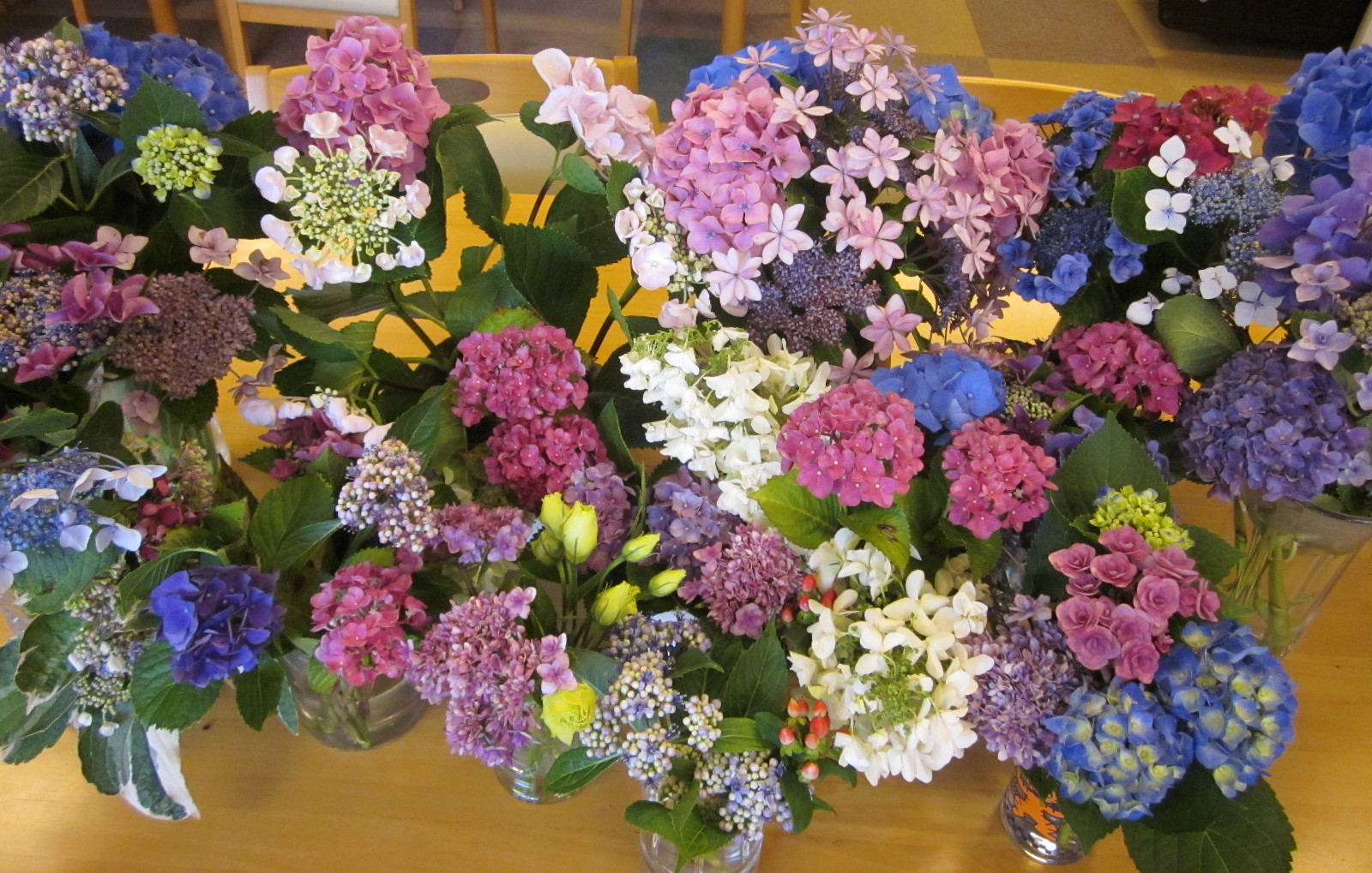 6月のデイサービス赤石では、雨の多いこの時期を室内で楽しんで頂こうと、御利用者様が過ごされるデイルームで各一週間にわたり、アジサイ祭り・トルコキキョウ祭りを開催しました!様々な形や色の種類に、大変喜ばれておられました!!