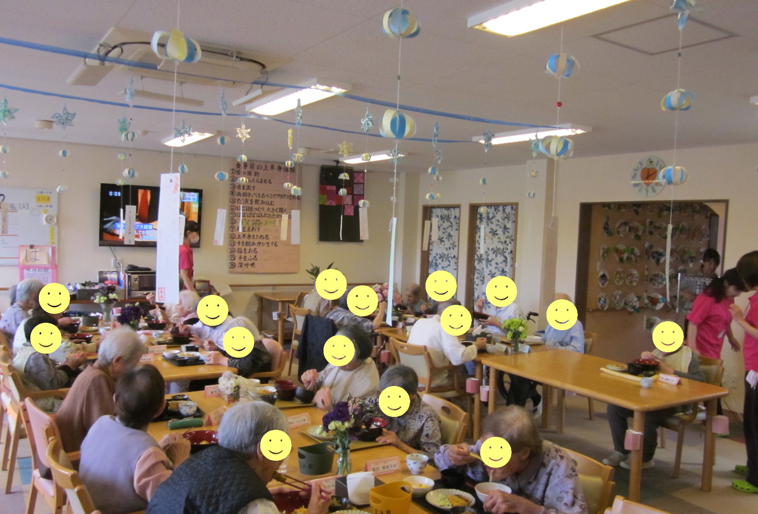 星飾りと丸飾りの下には短冊をつけ、御利用者様に、願事や意気込み等を思い思いに書いていただきデイルームに飾りました。風が通るたびに揺れとても素敵でした!!