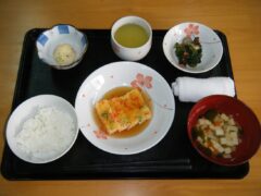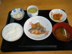 ホキの煮付け、かぼちゃの煮物、スパサラダ、お味噌汁