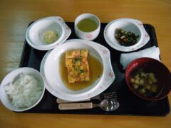 かに玉、ほうれん草の胡麻和え、ポテトサラダ、すまし汁