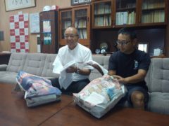 久瀬校長先生と加藤先生に、手縫いの雑巾を手渡ししてきました