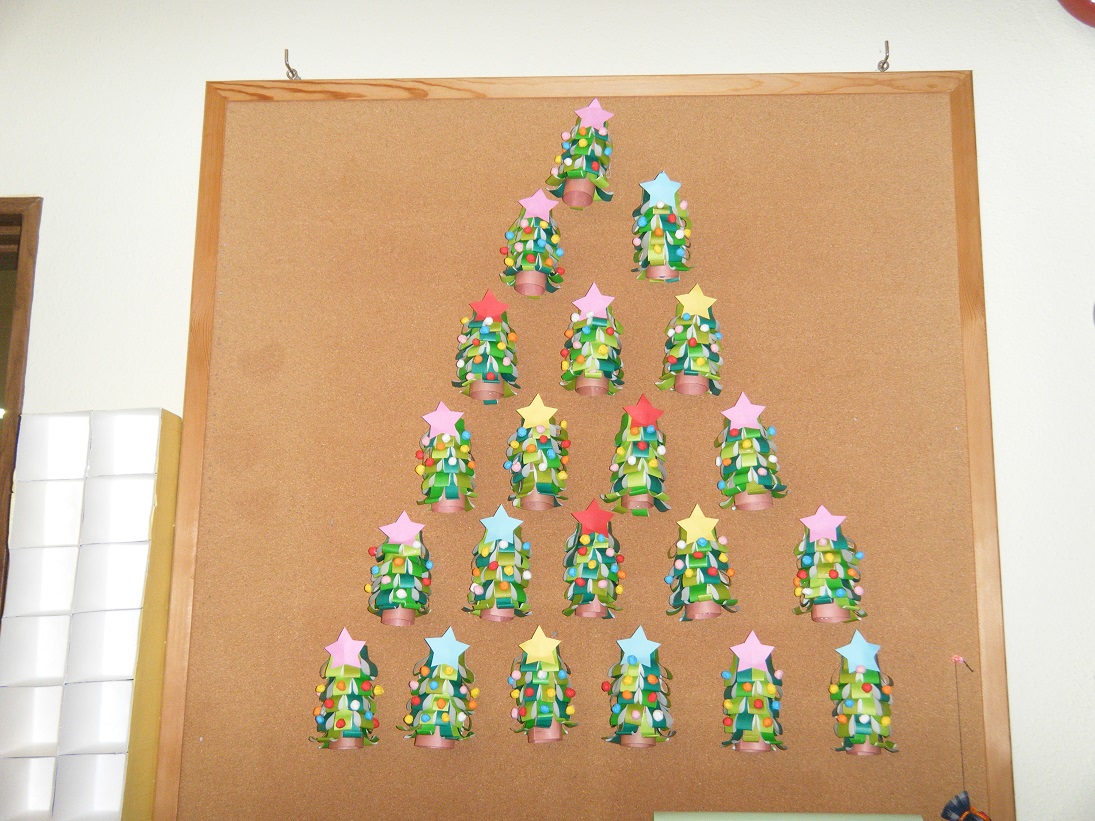 カラフルな布を使い、クリスマスツリーを作りました
