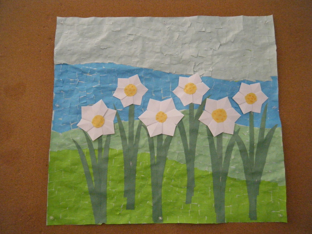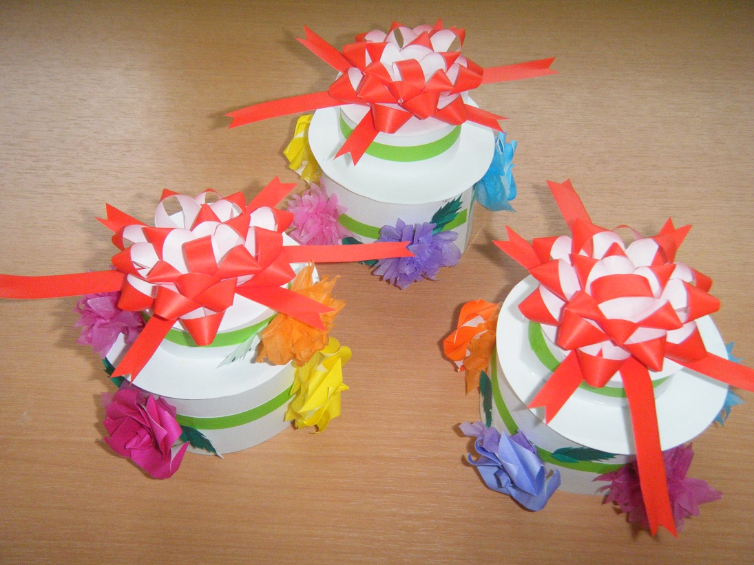 パーツ(折り紙でできた花やリボン)から、好きなものを