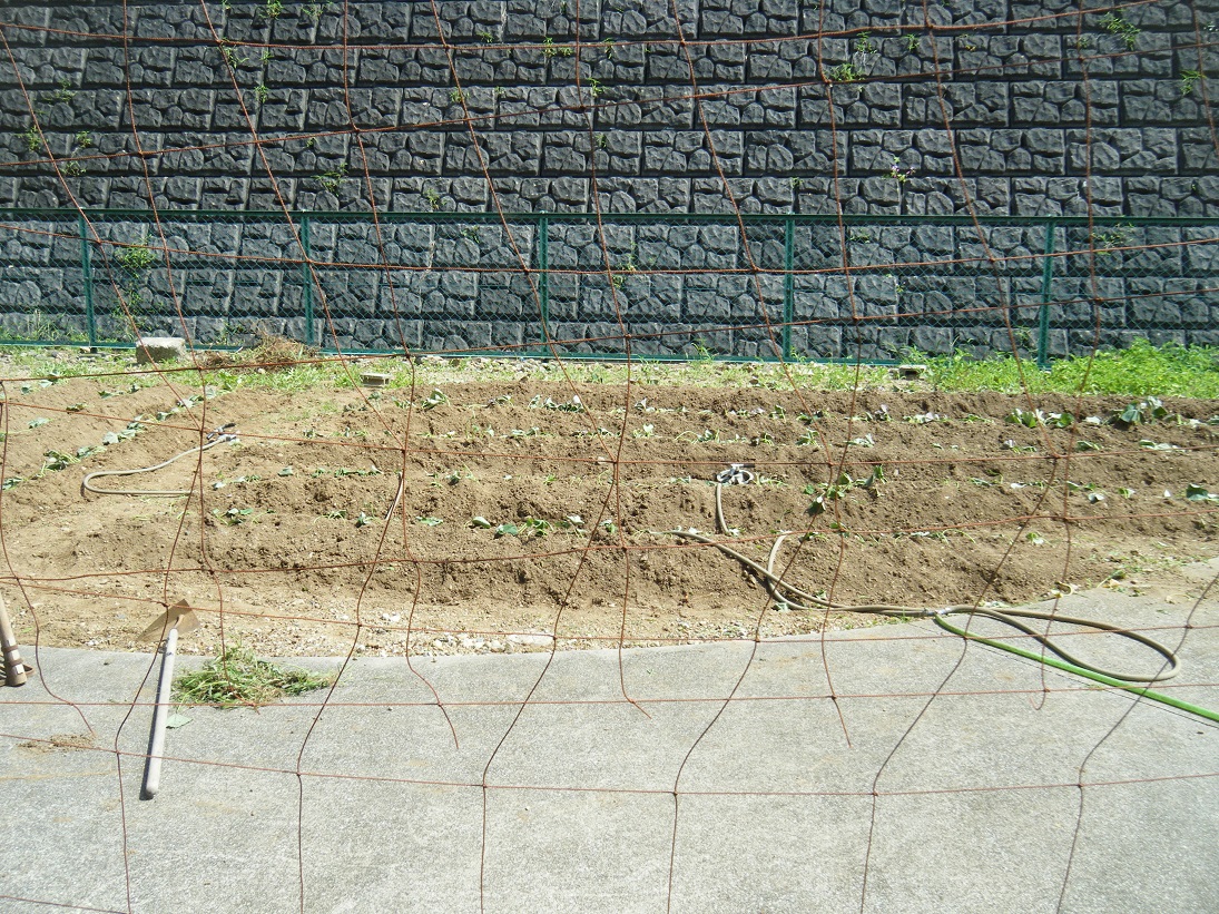 雨の合間に、さつま芋のつるをさしました