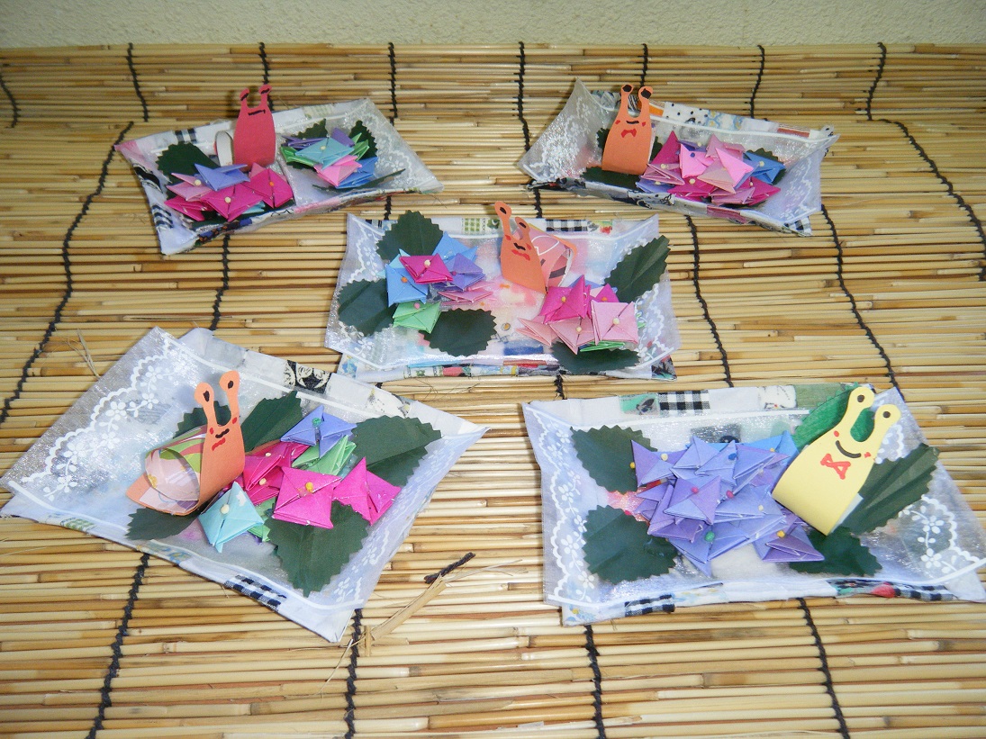 牛乳パックでかわいいトレーを作り、その上にかたつむりと