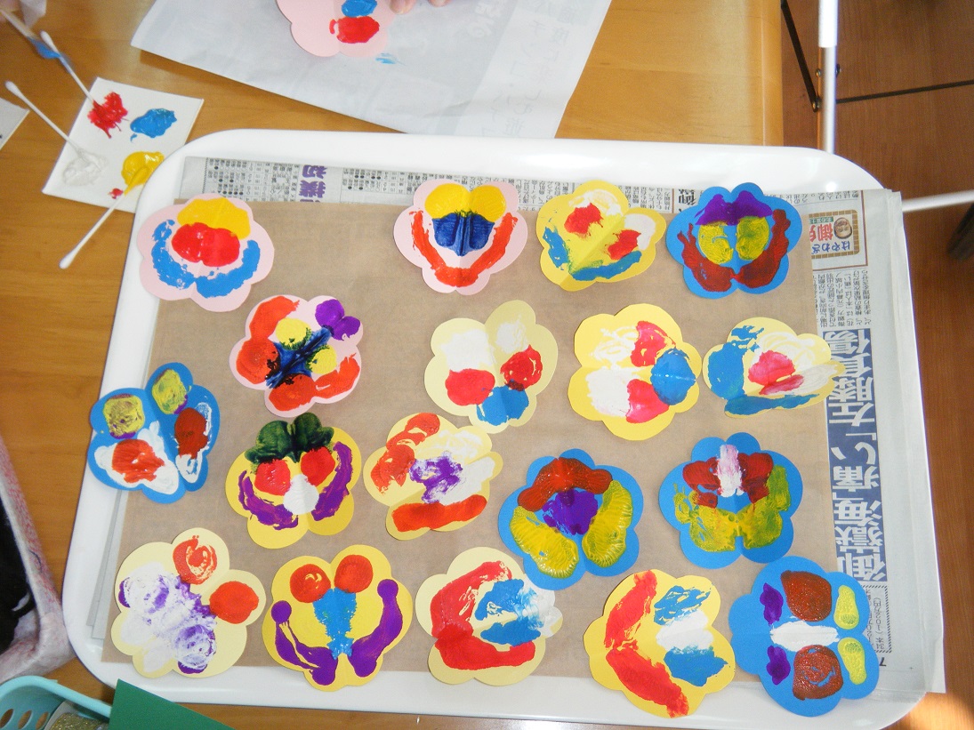 色画用紙と絵の具を使い、色とりどりのパンジーを